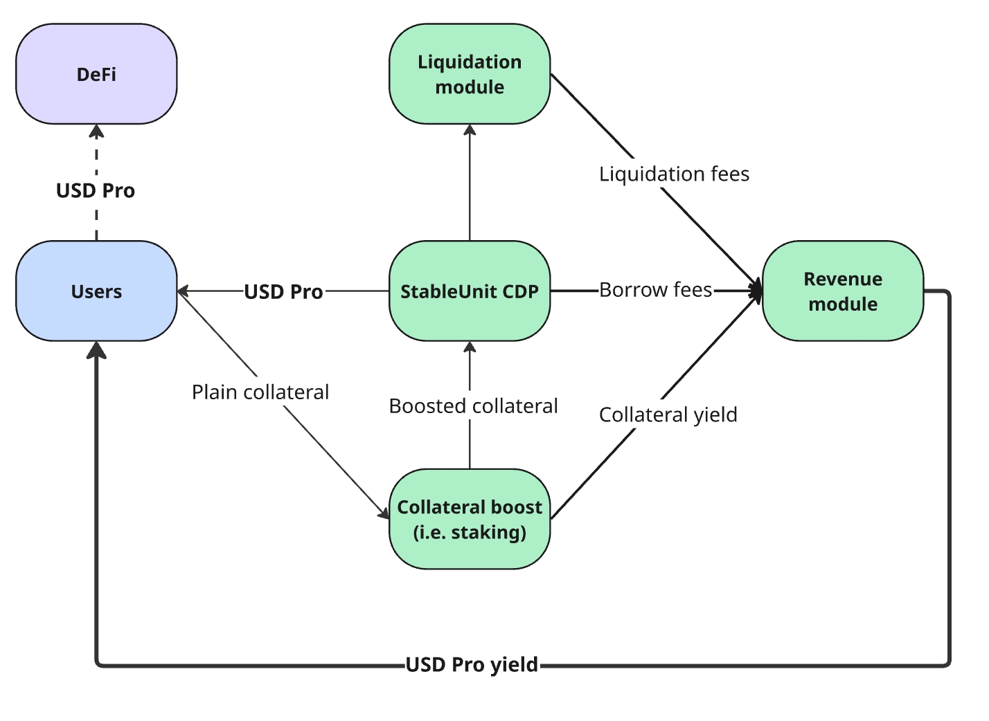 When a user wants liquidity, they deposit collateral (e.g., ETH, USDC, or an LP token) into a StableUnit vault to borrow USD Pro. At that moment StableUnit offers a “Boost collateral” option: • If the user accepts, the protocol instantly routes the collateral into a high-grade, on-chain strategy (staking ETH, restaking, or farming an LP) so the collateral itself starts earning extra yield. • If the user declines, the collateral simply stays idle in the vault.